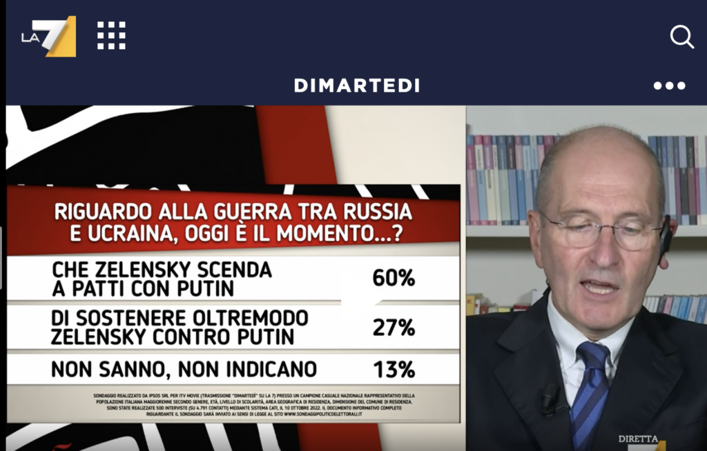 Ben il 60% del campione su cui è stato eseguito il sondaggio, quindi più della metà degli italiani, la maggioranza assoluta, dichiara che “Zelensky deve scendere a patti con Putin”. Solo il 27% di “sostenere oltremodo Zelensky contro Putin”, mentre una fetta ancora più piccola, il 13%, dichiara di non sapere rispondere o di non volerlo indicare.