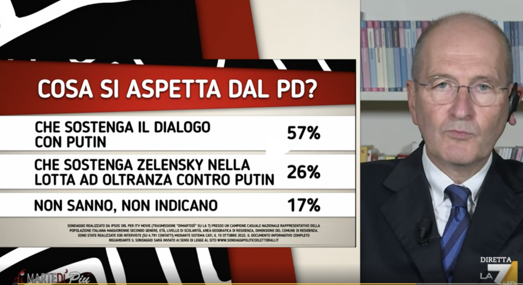 Inoltre, è stato chiesto quale posizione debba sostenere il Partito Democratico, la maggioranza ritiene debba sostenere il dialogo con Putin (57%), a seguire una parte (26%) sostiene Zelensky nella lotta ad oltranza contro Putin, mentre la parte più piccola (17%) non si esprime.